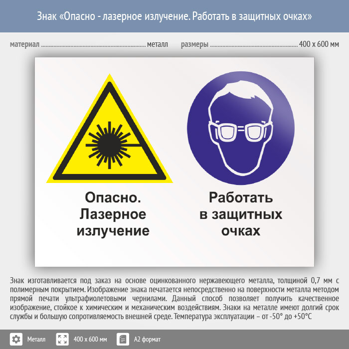 Знак «Опасно - лазерное излучение. Работать в защитных очках», КЗ-38 (металл, 600х400 мм) в Курске купить