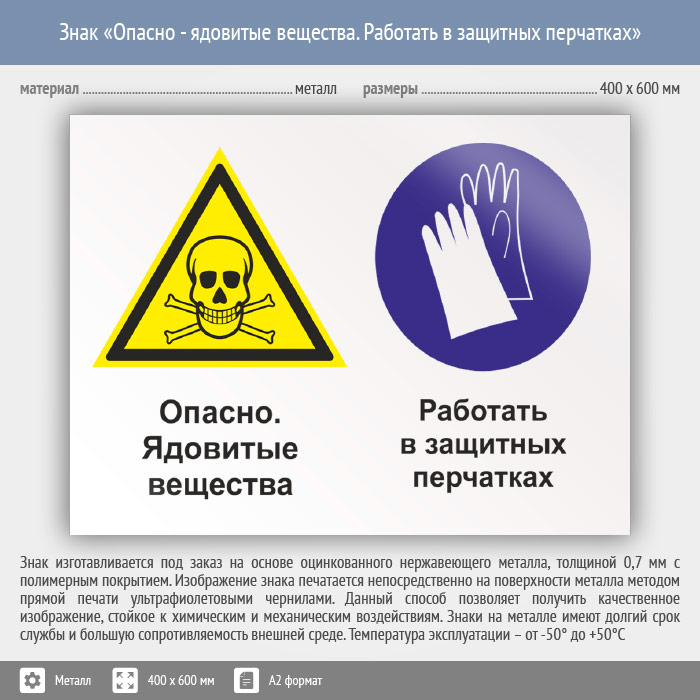 Знак «Опасно - ядовитые вещества. Работать в защитных перчатках», КЗ-43 (металл, 600х400 мм) в Курске купить