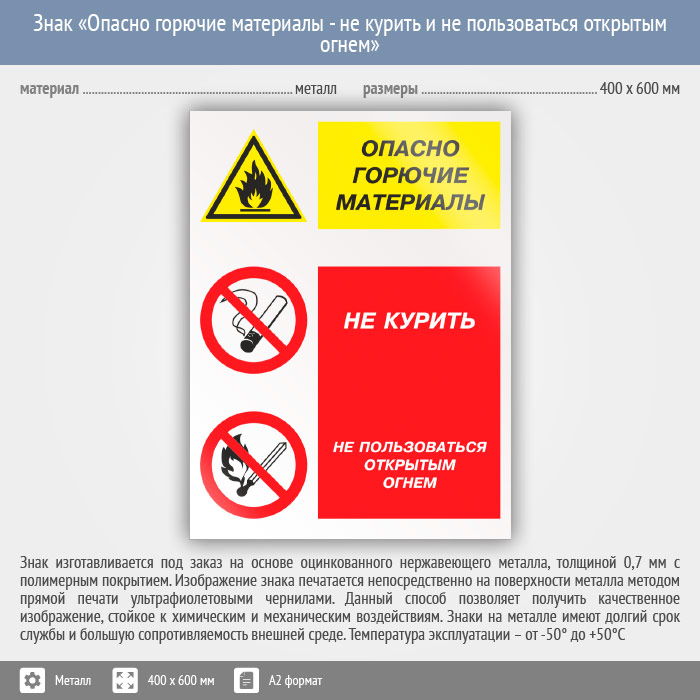 Знак «Опасно горючие материалы - не курить и не пользоваться открытым огнем», КЗ-45 (металл, 400х600 мм) в Курске купить