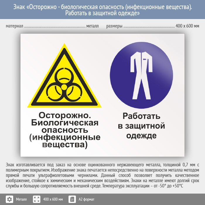 Знак «Осторожно - биологическая опасность (инфекционные вещества). Работать в защитной одежде», КЗ-53 (металл, 600х400 мм) в Курске купить