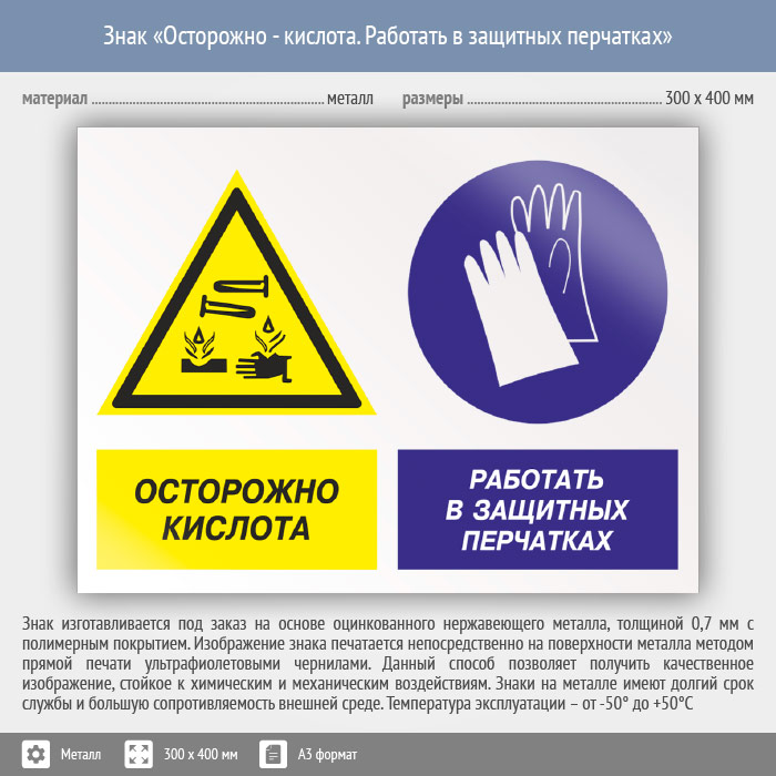 Знак «Осторожно - кислота. Работать в защитных перчатках», КЗ-56 (металл, 400х300 мм) в Курске купить