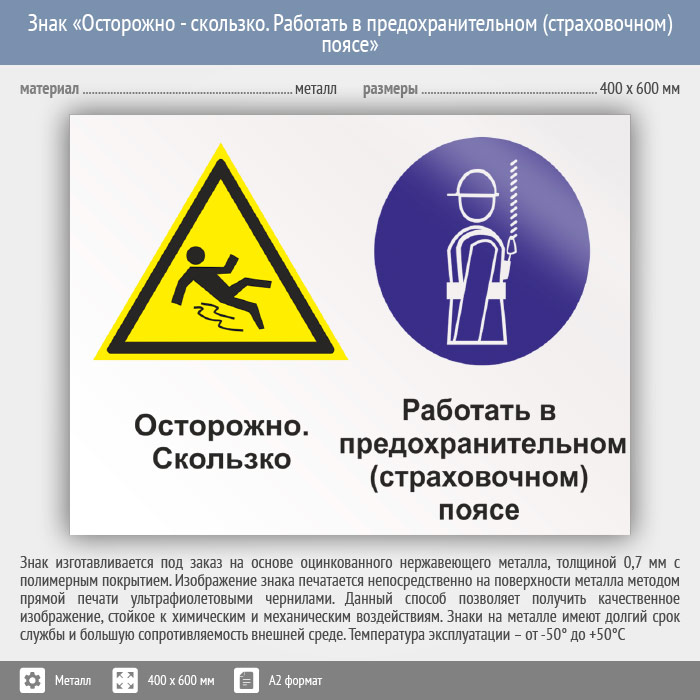 Знак «Осторожно - скользко. Работать в предохранительном (страховочном) поясе», КЗ-58 (металл, 600х400 мм) в Курске купить