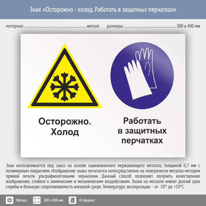 Знак «Осторожно - холод. Работать в защитных перчатках», КЗ-59 (металл, 400х300 мм) в Курске купить