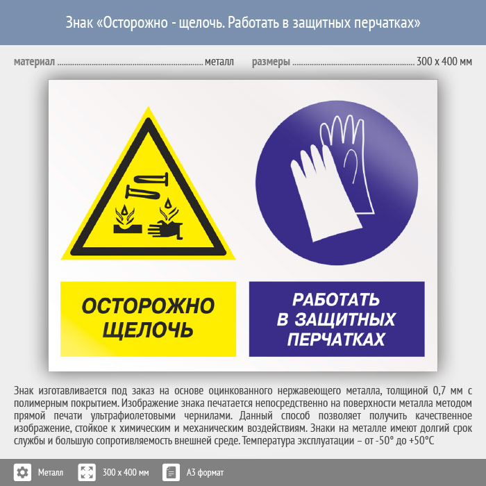 Знак «Осторожно - щелочь. Работать в защитных перчатках», КЗ-60 (металл, 400х300 мм) в Курске купить