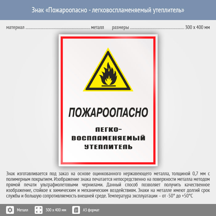 Знак «Пожароопасно - легковоспламеняемый утеплитель», КЗ-68 (металл, 300х400 мм) в Курске купить
