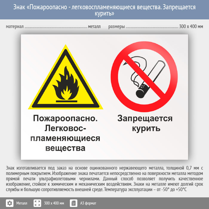 Знак «Пожароопасно - легковоспламеняющиеся вещества. Запрещается курить», КЗ-69 (металл, 400х300 мм) в Курске купить
