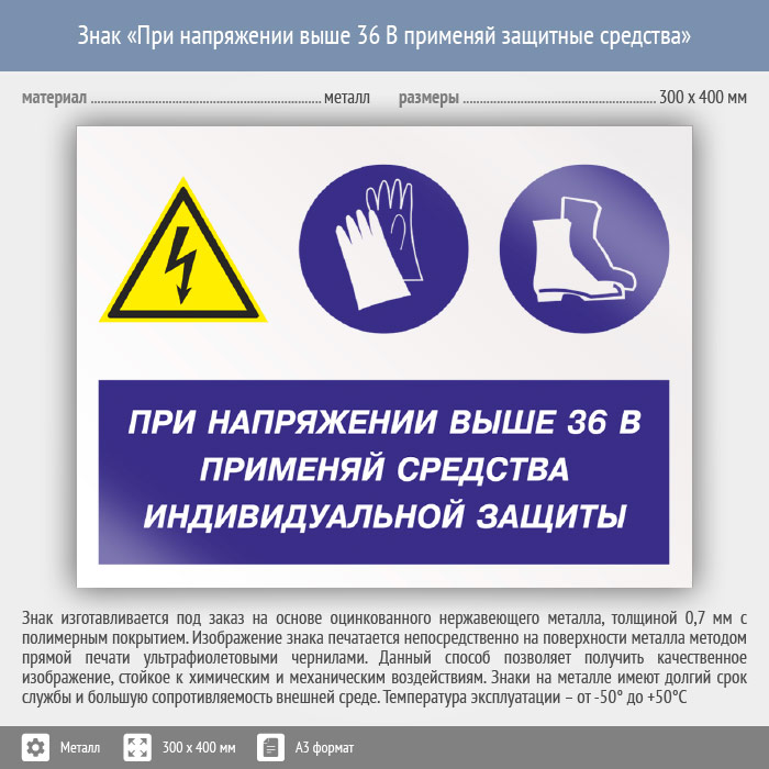 Знак «При напряжении выше 36 В применяй защитные средства», КЗ-71 (металл, 400х300 мм) в Курске купить