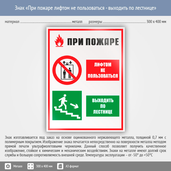 Знак «При пожаре лифтом не пользоваться - выходить по лестнице», КЗ-73 (металл, 300х400 мм) в Курске купить