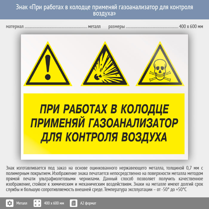 Знак «При работах в колодце применяй газоанализатор для контроля воздуха», КЗ-74 (металл, 600х400 мм) в Курске купить