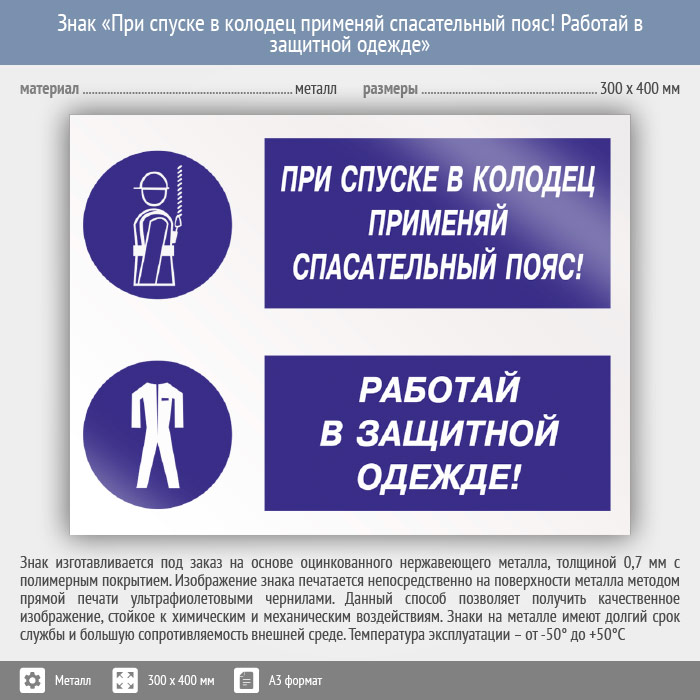 Знак «При спуске в колодец применяй спасательный пояс! Работай в защитной одежде», КЗ-76 (металл, 400х300 мм) в Курске купить