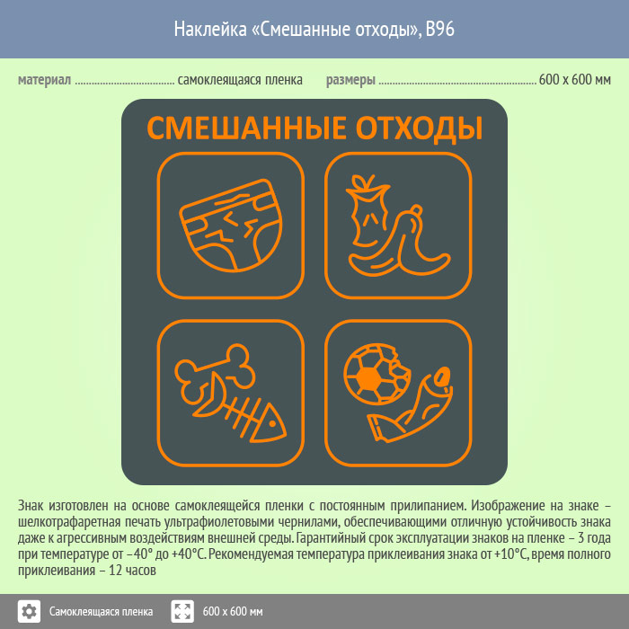 Наклейка на бак «Смешанные отходы», B96 изготавливается на самоклеящейся пленке в 5 типоразмерах - 600х600 мм, 500х500 мм, 400х400 мм, 200х200 мм и 150х150 мм и выполнена в соответствии с брендбуком согласно постановлению Правительства г. Москвы от 18 июня 2019 года N 734-ПП. Существует два варианта каждой наклейки - с ламинированием и без. Защита поверхности изображения ламинированием позволяет увеличить срок службы