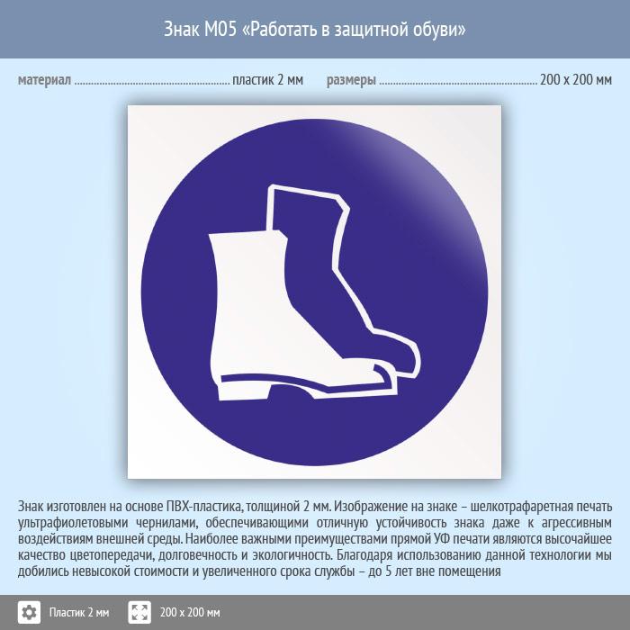 Знак M05 «Работать в защитной обуви» (пластик, 200х200 мм) в Курске купить