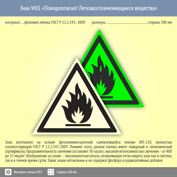 Знак W01 «Пожароопасно! легковоспламеняющиеся вещества» (фотолюминесцентная пленка ГОСТ 34428-2018, сторона 100 мм) в Курске купить
