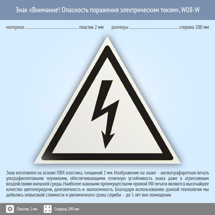 Знак W08-W «Внимание! опасность поражения электрическим током» (белый, пластик, сторона 200 мм) в Курске купить