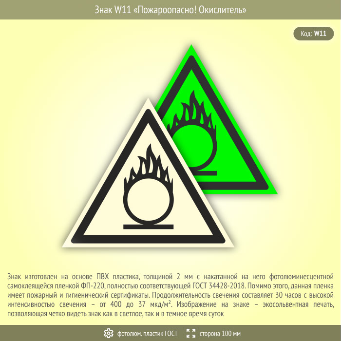 Знак W11 «Пожароопасно! Окислитель» (фотолюминесцентный пластик ГОСТ 34428-2018, сторона 100 мм) в Курске купить