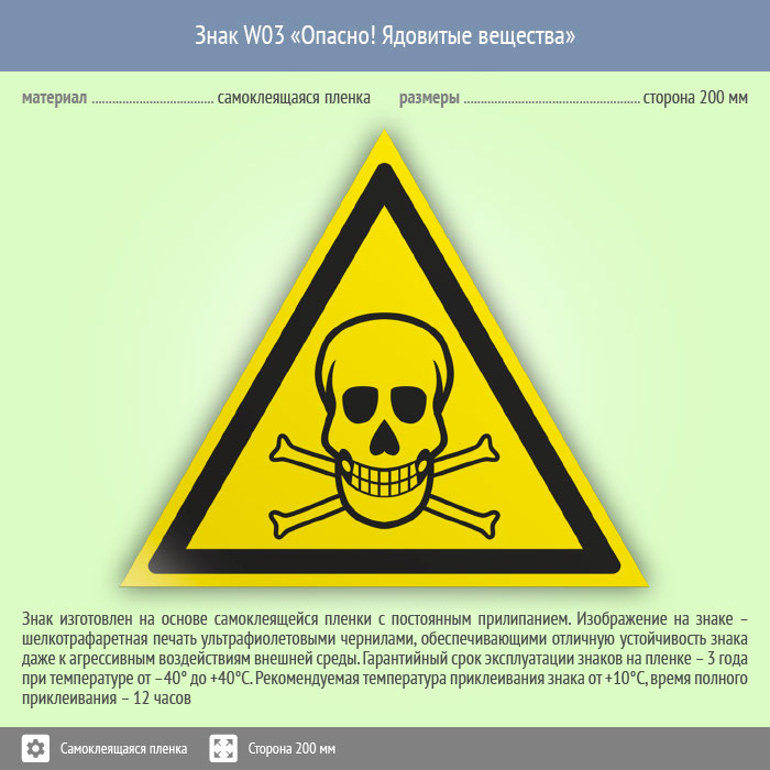 Знак W03 «Опасно! ядовитые вещества» (пленка, сторона 200 мм) в Курске купить