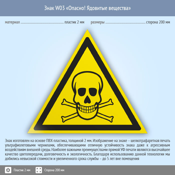 Знак W03 «Опасно! ядовитые вещества» (пластик, сторона 200 мм) в Курске купить