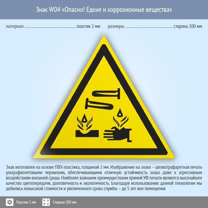 Знак W04 «Опасно! едкие и коррозионные вещества» (пластик, сторона 200 мм) в Курске купить