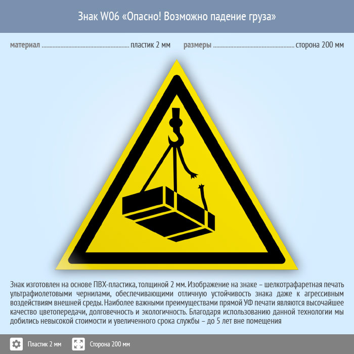 Знак W06 «Опасно! возможно падение груза» (пластик, сторона 200 мм) в Курске купить