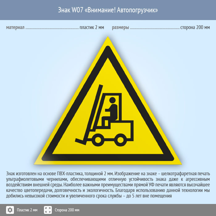 Знак W07 «Внимание! автопогрузчик» (пластик, сторона 200 мм) в Курске купить