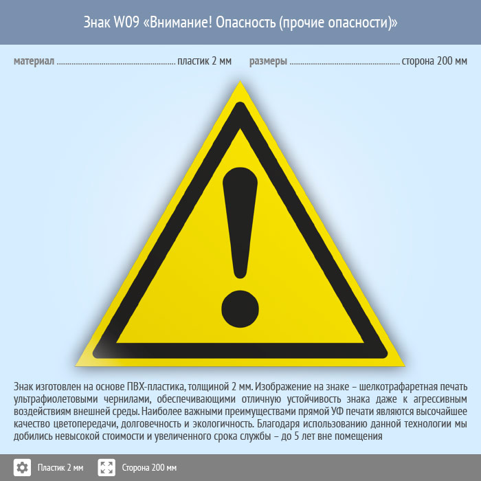 Знак W09 «Внимание! опасность (прочие опасности)» (пластик, сторона 200 мм) в Курске купить
