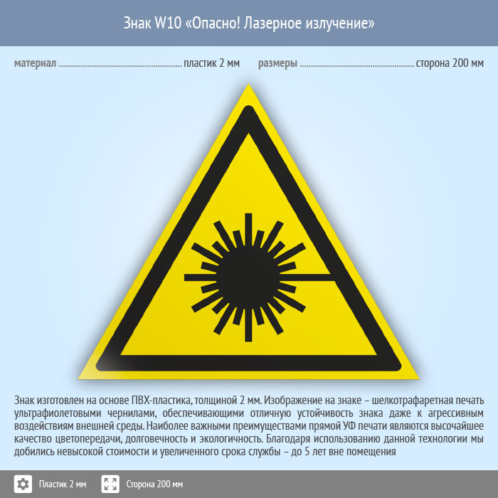 Знак W10 «Опасно! лазерное излучение» (пластик, сторона 200 мм) в Курске купить