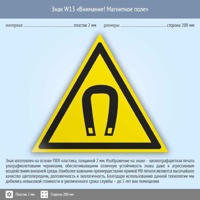 Знак W13 «Внимание! магнитное поле» (пластик, сторона 200 мм) в Курске купить
