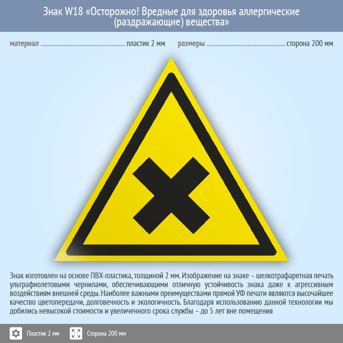 Знак W18 «Осторожно! вредные для здоровья аллергические (раздражающие) вещества» (пластик, сторона 200 мм) в Курске купить