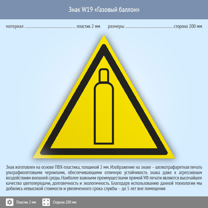 Знак W19 «Газовый баллон» (пластик, сторона 200 мм) в Курске купить