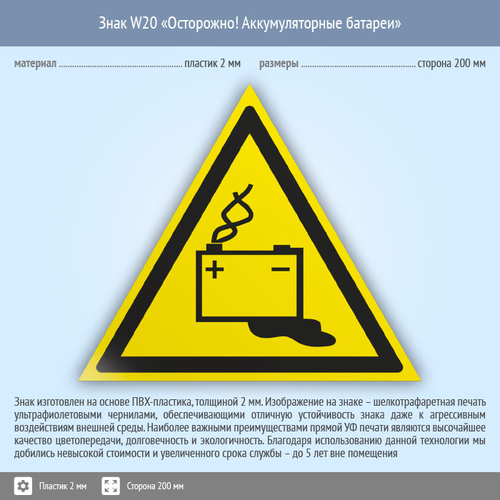Знак W20 «Осторожно! аккумуляторные батареи» (пластик, сторона 200 мм) в Курске купить