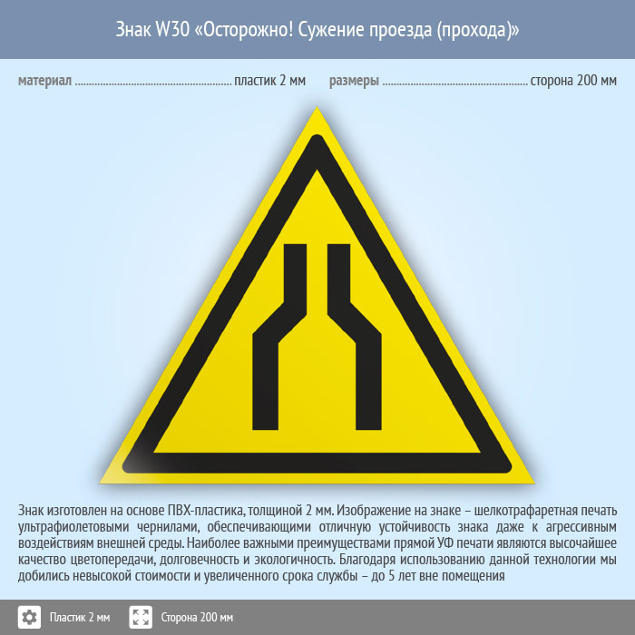 Знак W30 «Осторожно! сужение проезда (прохода)» (пластик, сторона 200 мм) в Курске купить