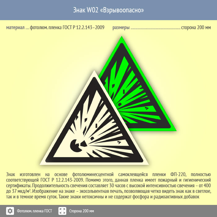 Знак W02 «Взрывоопасно» (фотолюминесцентная пленка ГОСТ 34428-2018, сторона 200 мм) в Курске купить
