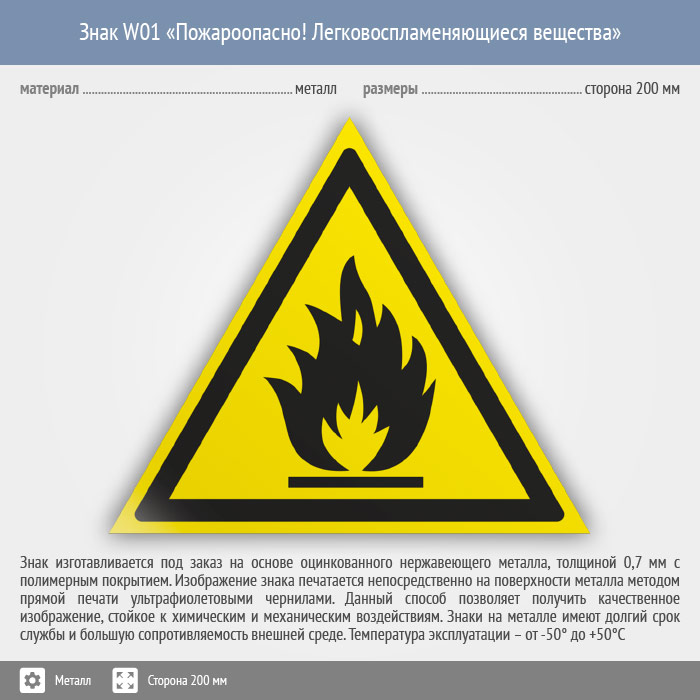 Знак W01 «Пожароопасно! легковоспламеняющиеся вещества» (металл, сторона 200 мм) в Курске купить
