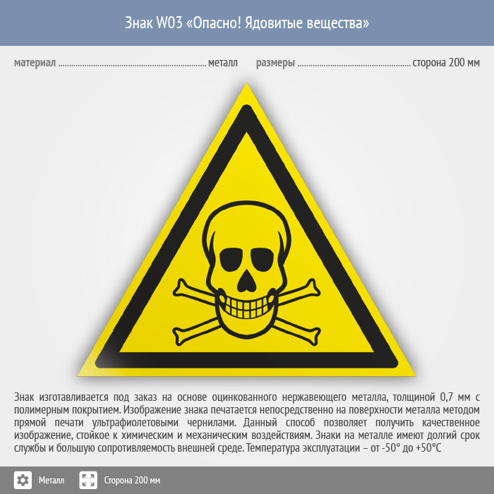 Знак W03 «Опасно! ядовитые вещества» (металл, сторона 200 мм) в Курске купить