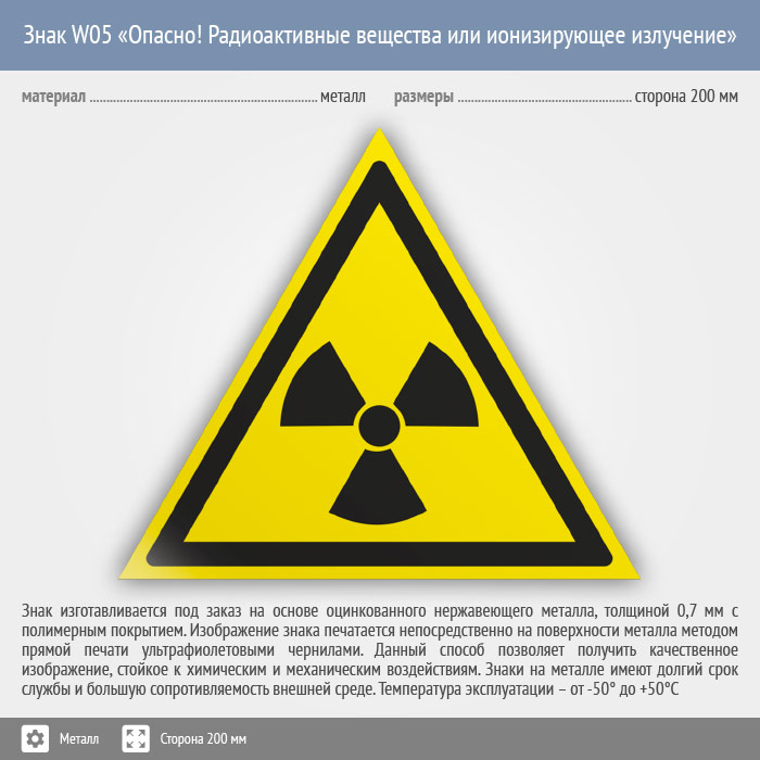 Знак W05 «Опасно! радиоактивные вещества или ионизирующее излучение» (металл, сторона 200 мм) в Курске купить