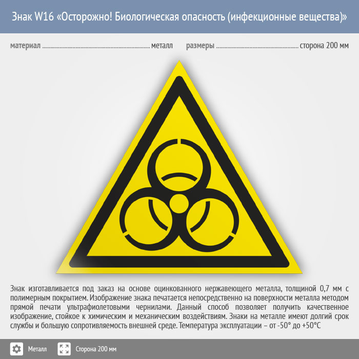 Знак W16 «Осторожно! биологическая опасность (инфекционные вещества)» (металл, сторона 200 мм) в Курске купить