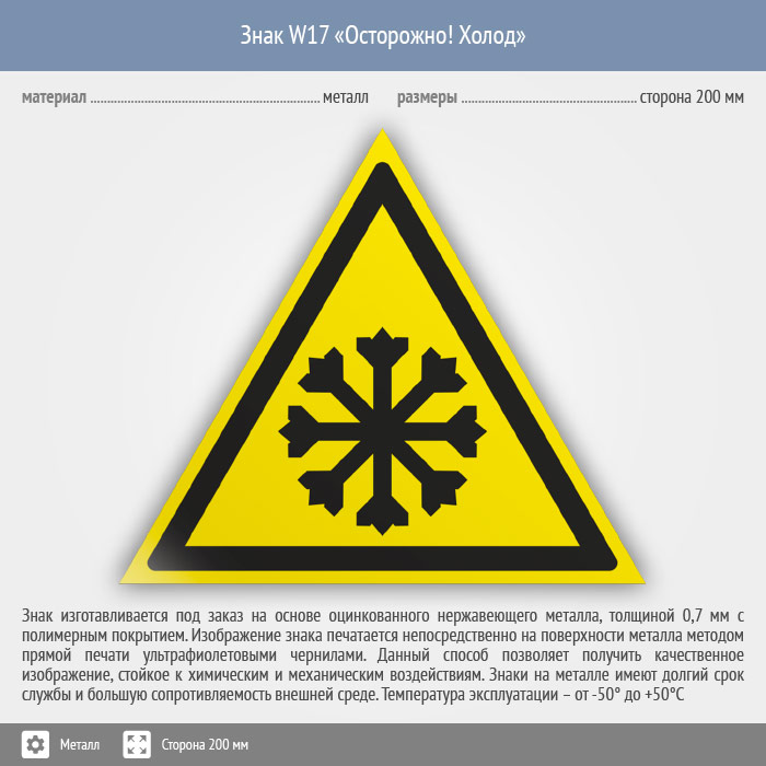 Знак W17 «Осторожно! холод» (металл, сторона 200 мм) в Курске купить