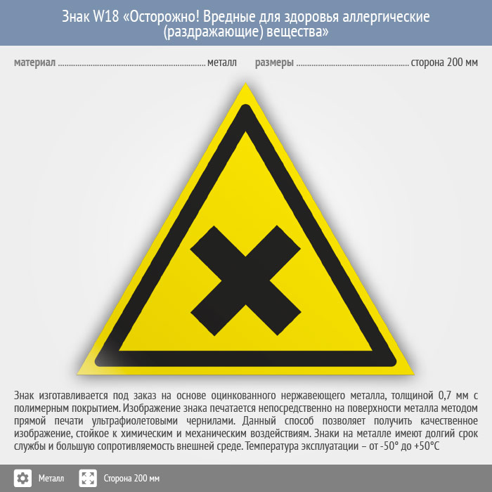 Знак W18 «Осторожно! вредные для здоровья аллергические (раздражающие) вещества» (металл, сторона 200 мм) в Курске купить