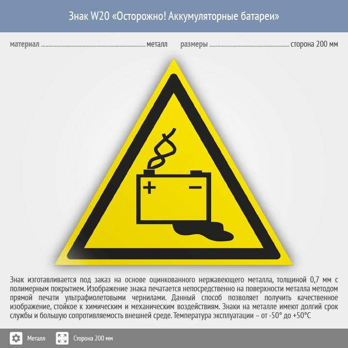 Знак W20 «Осторожно! аккумуляторные батареи» (металл, сторона 200 мм) в Курске купить