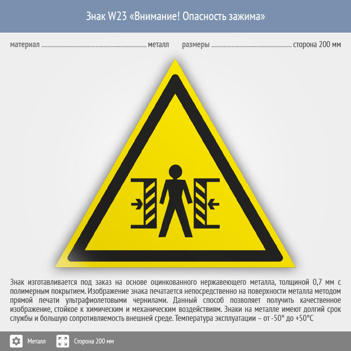 Знак W23 «Внимание! опасность зажима» (металл, сторона 200 мм) в Курске купить