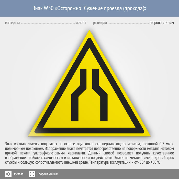 Знак W30 «Осторожно! сужение проезда (прохода)» (металл, сторона 200 мм) в Курске купить