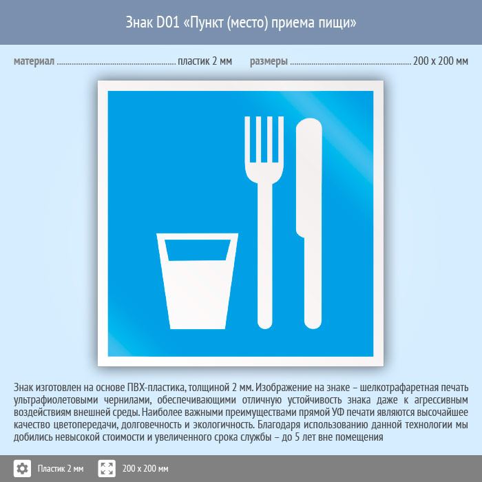 Знак D01 «Пункт (место) приема пищи» (пластик, 200х200 мм) в Курске купить