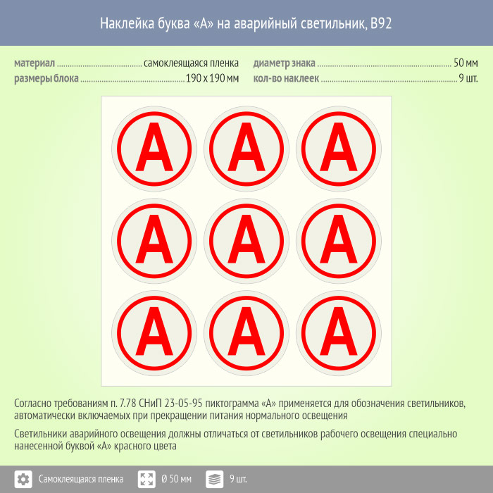 Наклейка буква «А» на аварийный светильник, B92 (пленка, диаметр 50 мм, блок 9 штук, 190х190 мм) в Курске купить