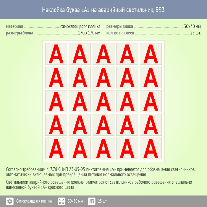 Наклейка буква «А» на аварийный светильник, B93 (пленка, 30х30 мм, блок 25 штук, 170х170 мм) в Курске купить