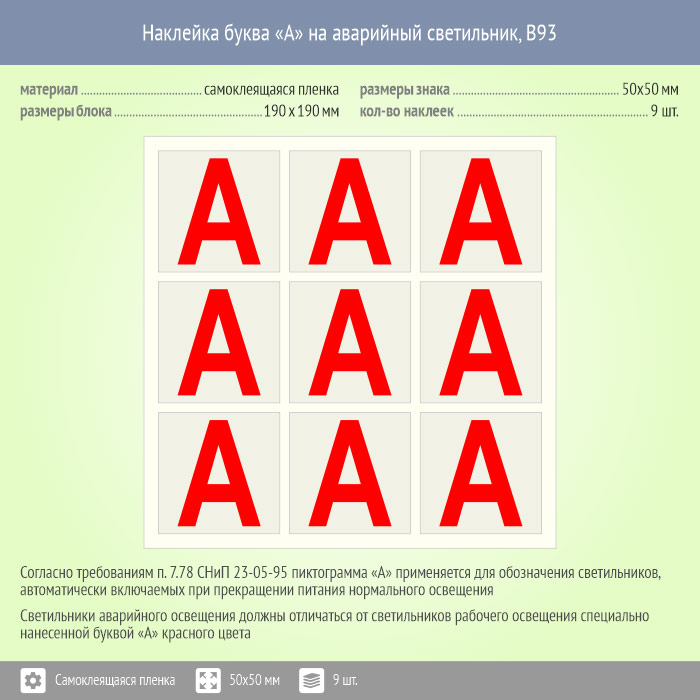 Наклейка буква «А» на аварийный светильник, B93 (пленка, 50х50 мм, блок 9 штук, 190х190 мм) в Курске купить