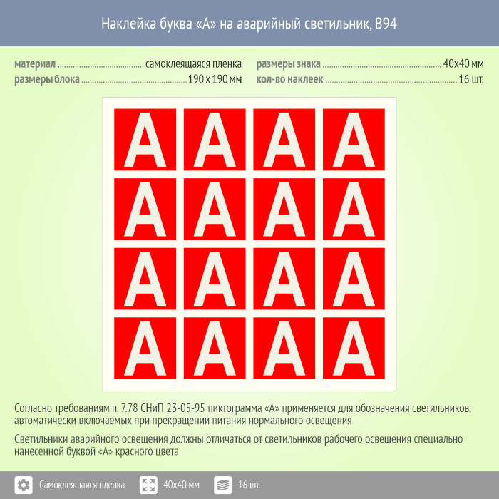 Наклейка буква «А» на аварийный светильник, B94 (пленка, 40х40 мм, блок 16 штук, 190х190 мм) в Курске купить