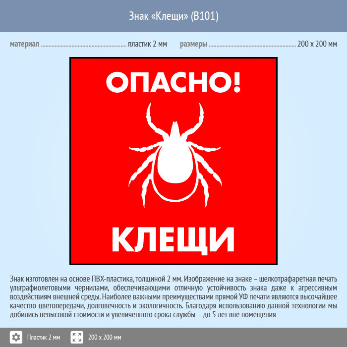Знак «Опасно! Клещи», B101 (пластик, 200х200 мм) в Курске купить
