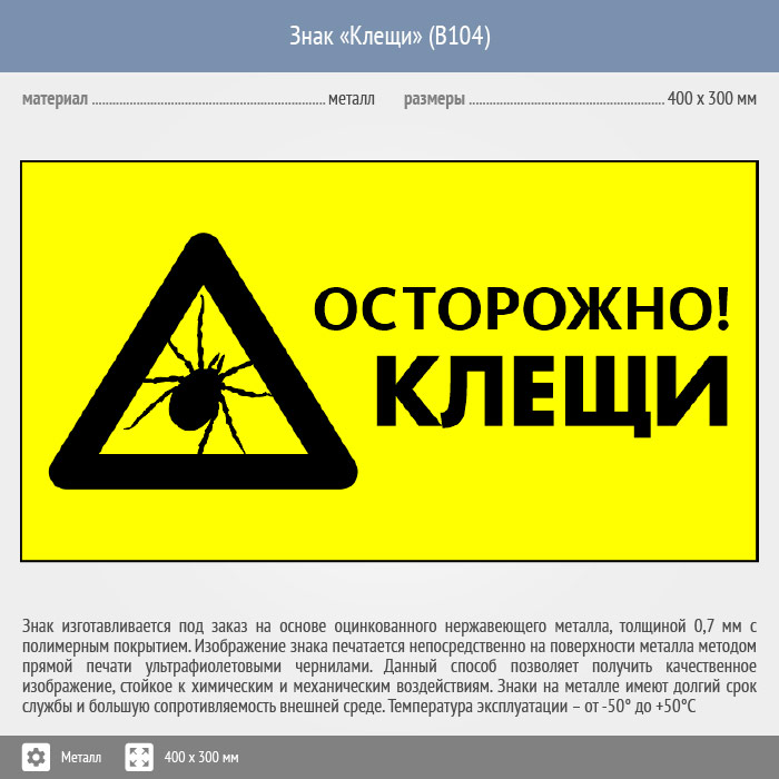 Знак «Осторожно! Клещи», B104 (металл, 300х200 мм) в Курске купить
