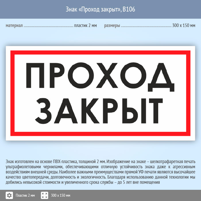 Знак «Проход закрыт», B106 (пластик, 300х150 мм) в Курске купить
