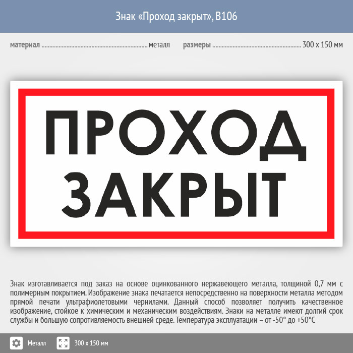 Знак «Проход закрыт», B106 (металл, 300х150 мм) в Курске купить
